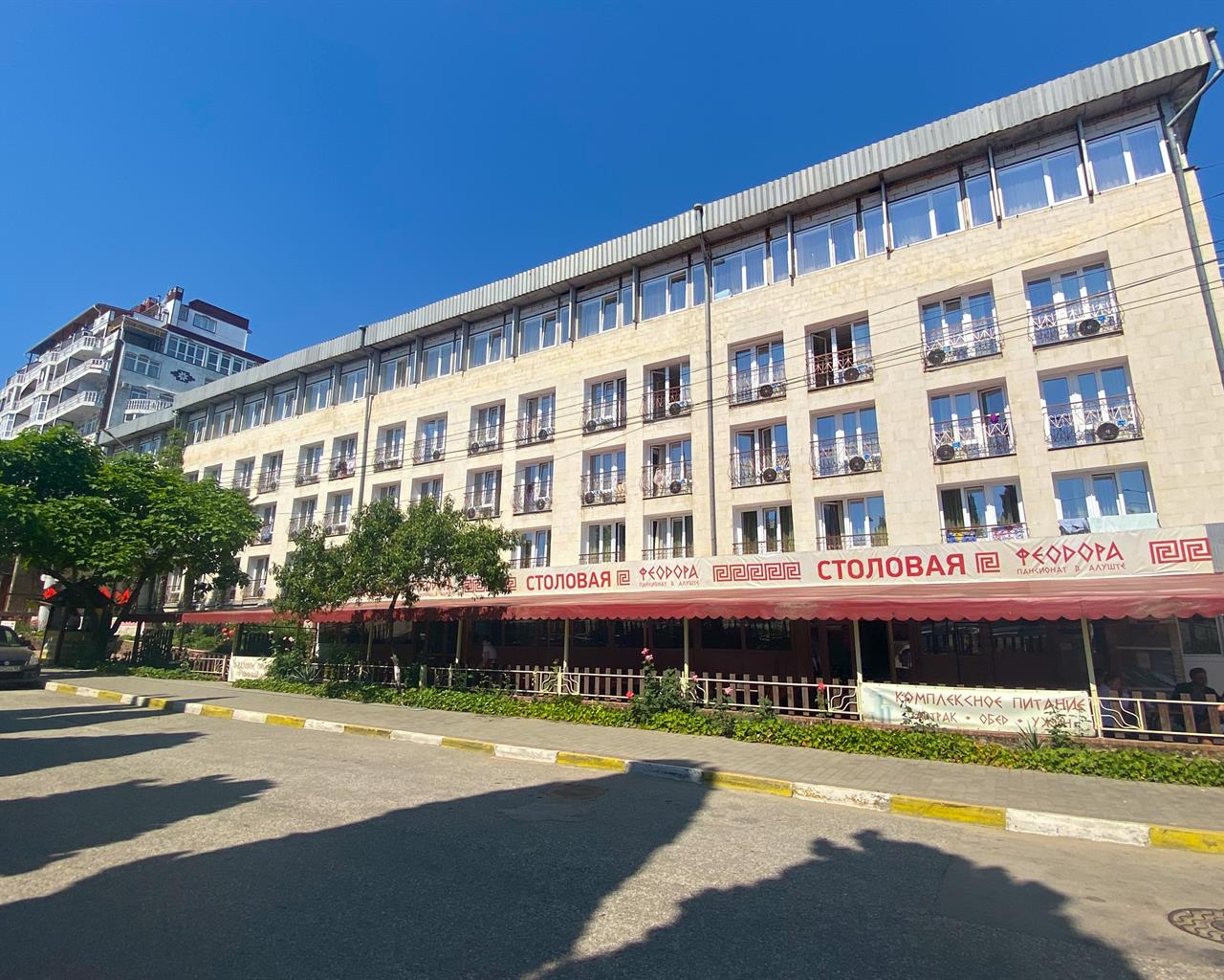Пансионат "Феодора" находится на самом берегу моря в Профессорском уголке – это район, расположенный у подножия горы Кастель, который находится на западе Алушты. В 2022 г. была проведена полная реконструкция номерного фонда. Территория пансионата расположена на самой набережной. Недалеко расположен причал, откуда курсируют катера по различным городам Крыма. Профессорский уголок имеет особый микроклимат, включает в себя парковую зону, набережную, аквапарк, боулинг, кафе, рестораны и пр.